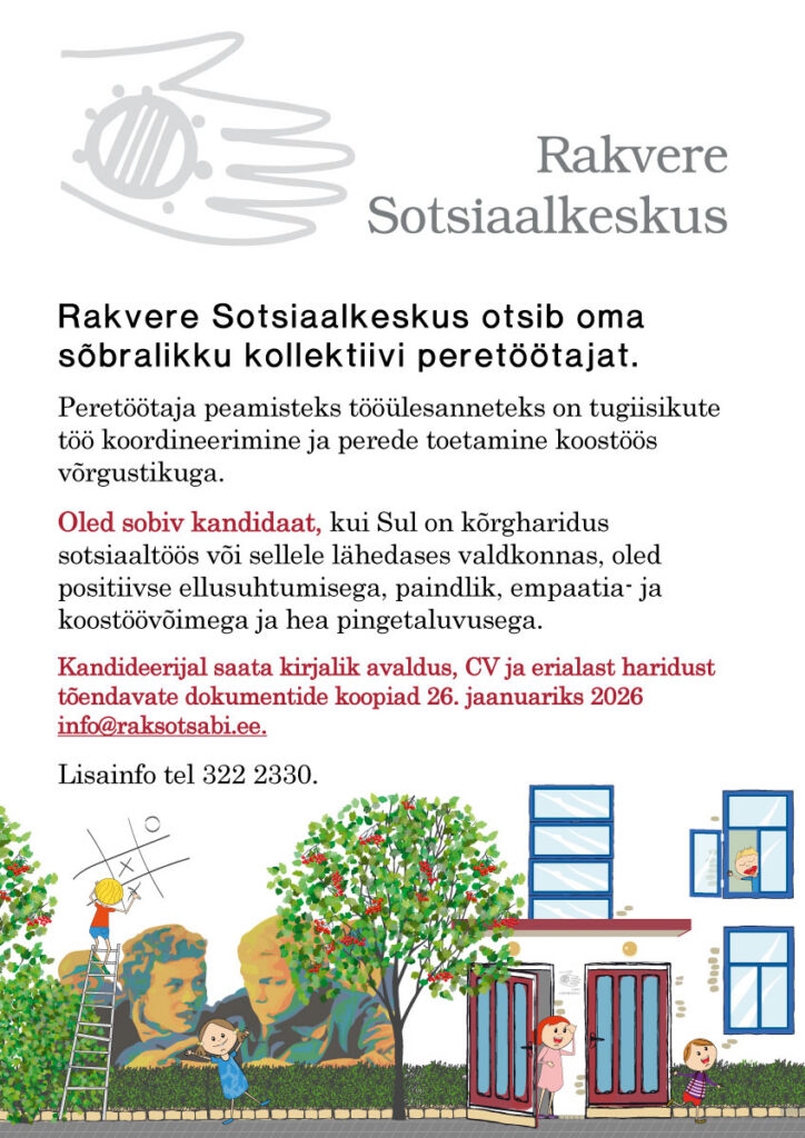 Kirjalikku avaldust, CV ja erialast haridust tõendava dokumendi koopiat ootame 26.jaanuariks 2026a info@raksotsabi.ee